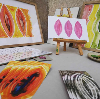 Jag började utforska min kreativa ådra för cirka fyra år sedan när jag fick barn. Föräldrafödelsen krävde en ventil för allt som behövde bearbetas. Jag började måla med flytande akvarell i starka färger. Det blev upprepade mönster av abstrakta kvinnoprofiler och symmetri. “Snittet” är en form som återkommer i mina målningar och representerar mitt kejsarsnitt ur vilket jag födde mitt barn. Mitt verk “Belly shapes” har tryckts på tyg i form av tote bags och ett av mina digitala alster har tryckts på vad jag kallar “snittfickor” (necessär/pennskrin). Mina prints skrivs ut på en Arto-skrivare vilket ger ett fantastiskt resultat, i sällsynta fall säljer jag även originalakvareller.
